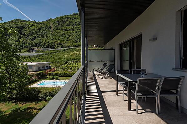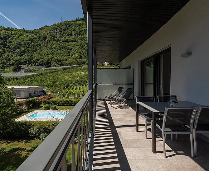 Both apartments offer a beautiful view of the surrounding hills and mountains and are south-facing. Thanks to the large window facades, the boundaries between the inside and outside world disappear and the furnished balconies invite you to enjoy a leisurely breakfast and to relax and unwind in the fresh air.