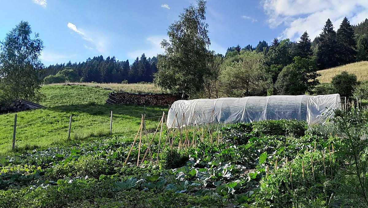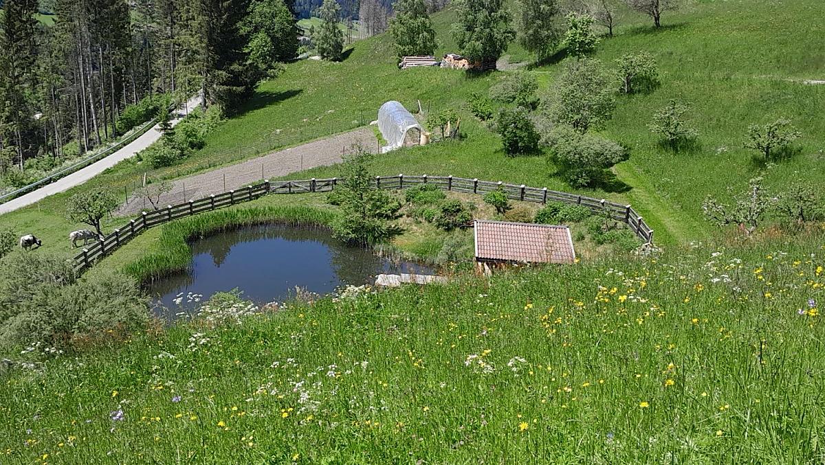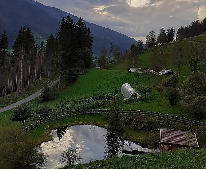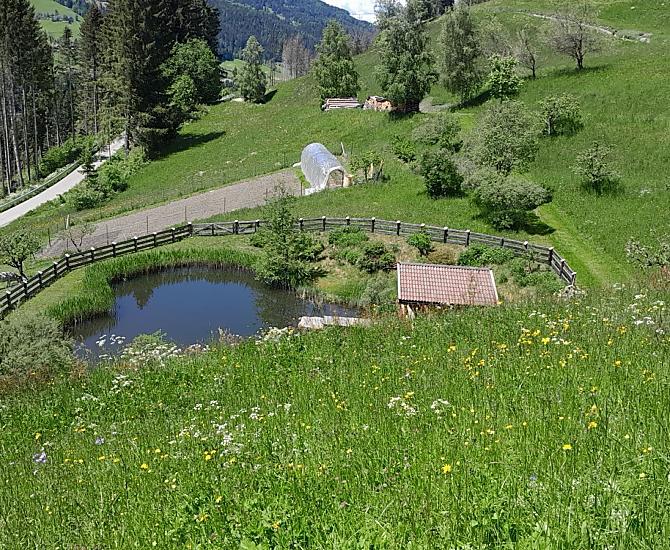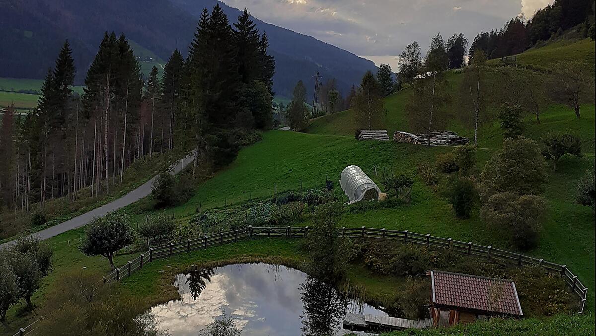 The organic farm is in a beautiful and secluded location, surrounded by woods, hedges and grassland. Near the farm, you can explore the medicinal plant trail. Next to the pond is our vegetable garden, from where a dirt track leads to our garden and terrace full of currants and raspberries. (On 19 August 2025, the Laimburg Research Centre, Ms Kathrin Plunger, presented us with the plaque and certificate for ecological gardening ‘Natur im Garten’/’Nature in the Garden’, as our farm meets all the core criteria for biodiversity required for this award).