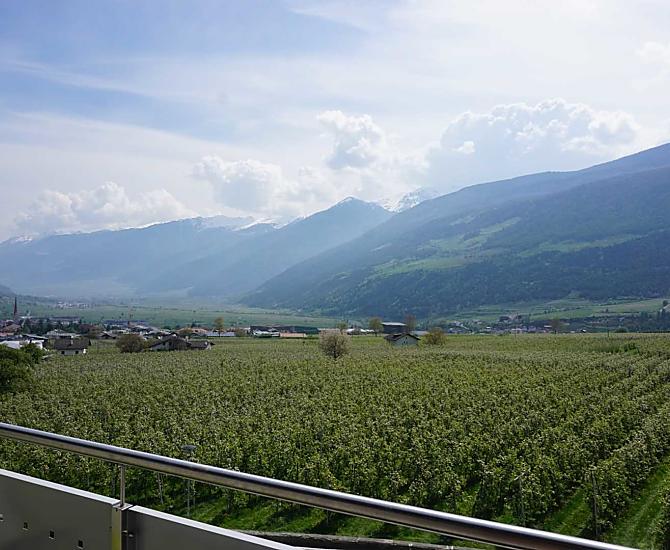 Our fruit farm is located in Kortsch near Schlanders, in beautiful Vinschgau, between the Reschen Pass and the spa town of Meran. The valley is known as the part of South Tyrol that offers the most hours of sunshine (over 300 sunny days a year). The Waalhof is located in this unique mountain landscape, in the midst of the apple orchards of Vinschgau. With us you can spend your holidays in a familiar, friendly atmosphere, far away from the stress of everyday life. Our large holiday apartment and our one-room apartments offer a fantastic view of the fascinating Vinschger mountains.
