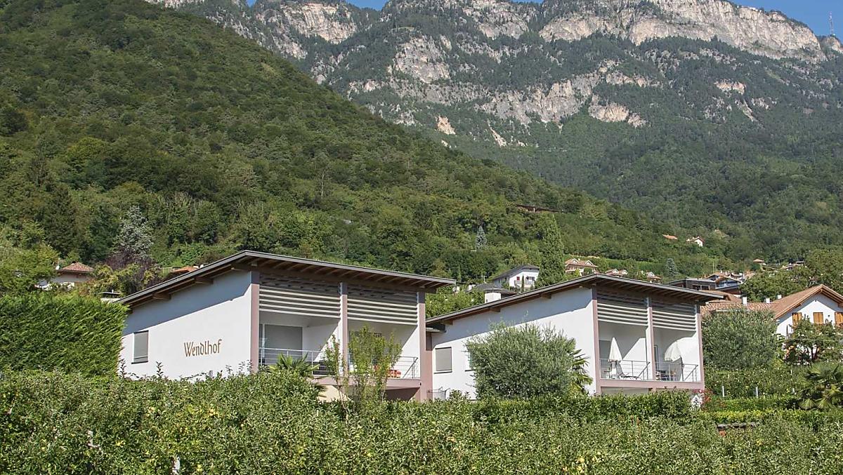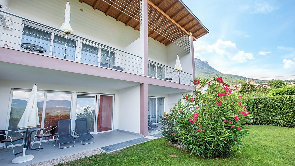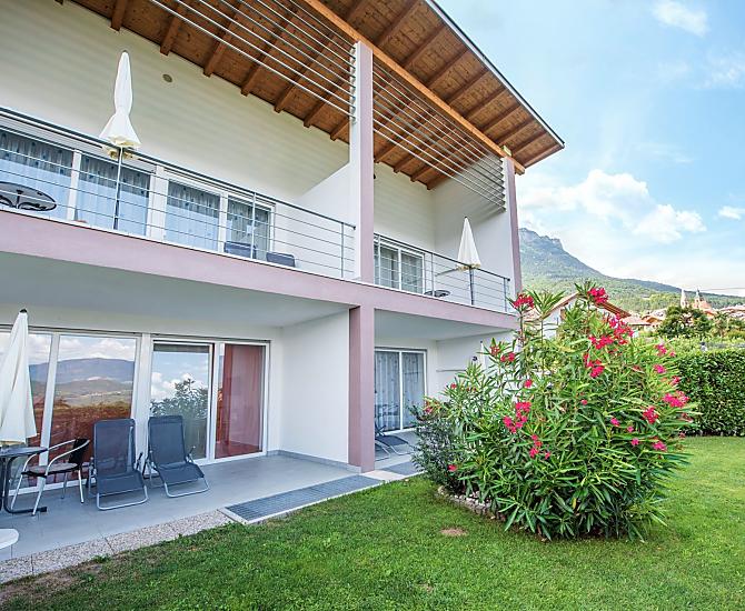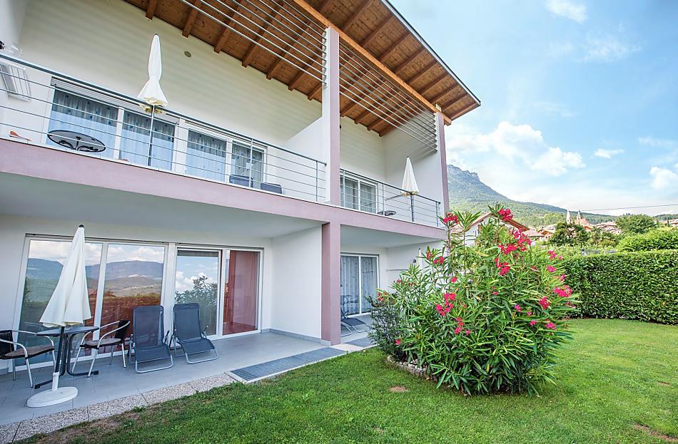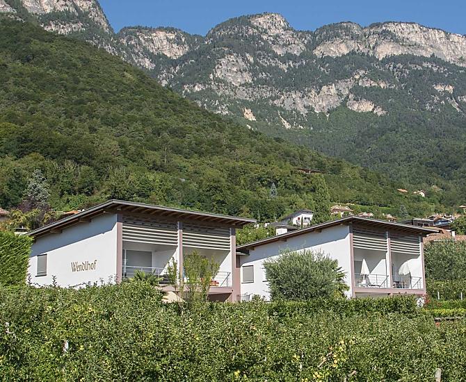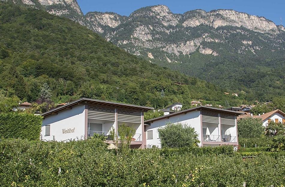Neu erbauter, moderner Obstbauernhof im Süden Südtirols mit sonnigen Ferienwohnungen und schönem Panoramablick über die Obst- und Weinlandschaft sowie auf die Dolomiten.