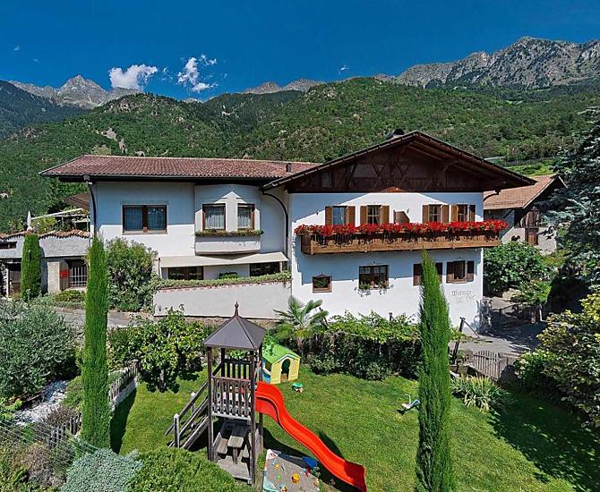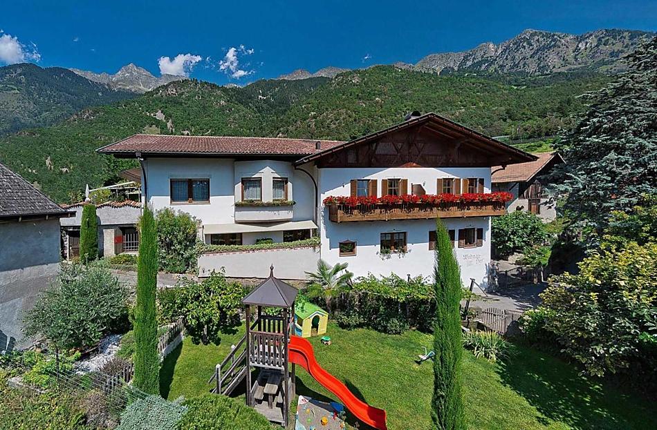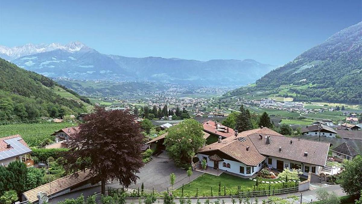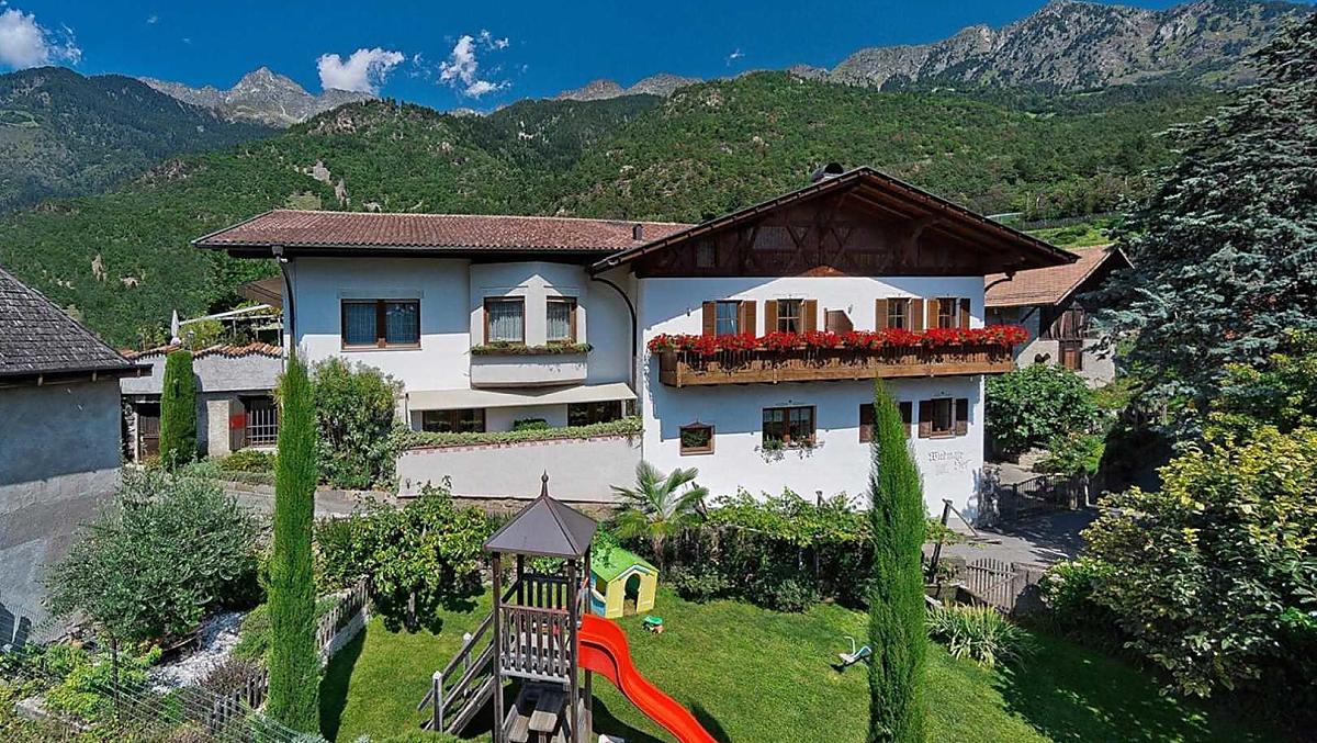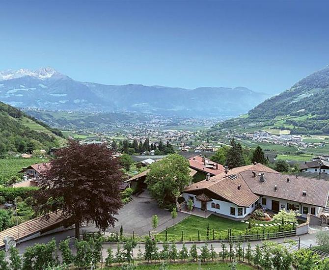 The fruit farm was built in 1318 and is located on a hill from which you have an unforgettable view of the surrounding mountains, Algund and Meran. The Wiedmair Hof has a history rich in tradition and was placed under ensemble protection. Due to the special location between orchards and vineyards directly above the Algunder Waalweg, there are many excursion possibilities directly from the house (carefree hikes and mountain tours). The bike path is also only 250 meters away. The bus stop is right in front of our farm and allows you to reach Algund and the spa town of Meran in a short time without using your car. We offer a large lawn, children's playground and sun terrace to relax and let off steam. The apartments are lovingly and comfortably furnished to measure by the carpenter, each has a large balcony and free WiFi.