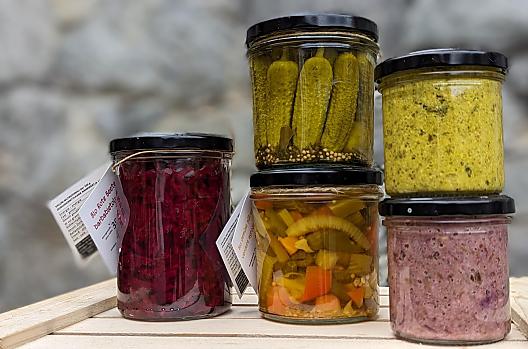 The ‘sauces and pickles product group sparks culinary delight. Whether savoury or sweet, preserved in vinegar or oil, all the ‘Roter Hahn’ delicacies have one thing in common, they are full of flavour and are free of any additives. The raw ingredients used in delicious sauces, spreads and pestos must be just as impeccable as those used for pickled fruit and vegetables. While the former provide the right flavour with their creamy consistency, the latter are fresh and crisp. Only select fruit and vegetables go into the jar, which are preserved just how your grandmother used to do it. A treat for gourmets.