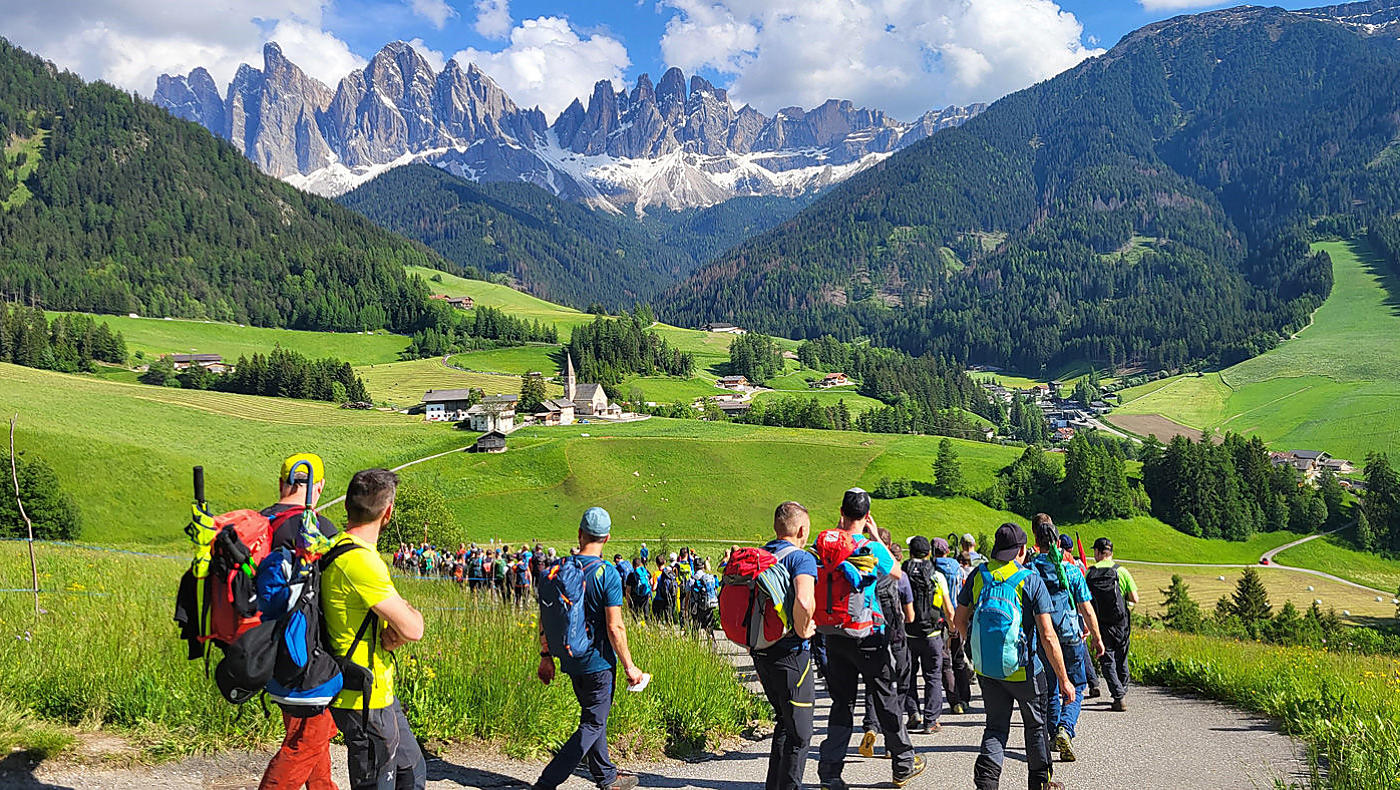 The men from the Gadertal parishes meet in Pescol and march over Medalges Joch pass to St. Magdalena in Villnösstal valley, where they meet up with another group of pilgrims from Lower Gadertal valley. This group starts from Untermoi and crosses Würzjoch pass to St. Magdalena. The complete group then carries on walking to St. Peter in Villnösstal valley, where the procession is given a warm welcome from the locals and their 'Musikkapelle', the wind and brass band, and every pilgrim seeks out somewhere to stay for the night. Early next day, the company of pilgrims sets out for Säben Abbey. They then return to St. Peter, where they spend a second night.