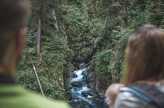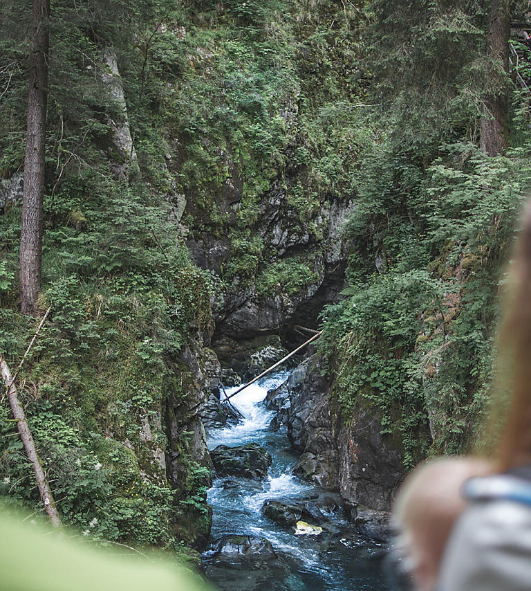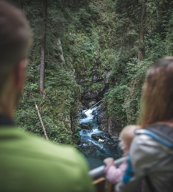 The stream rushes through the wild gorge. Water splashes against the rock faces, which are not quite as white as you'd expect from light marble – moss and lichen have coloured the stone green and black. Only the stones in the bed of the stream are a light colour. The little ones can splash around there and build little dams, while their parents can recharge their batteries in the exhilarating surroundings. This path is especially popular during the summer, as the water and rocks provide a way of cooling off. The Gilfenklamm gorge is rightly considered to be one of the finest accessible gorges in the Alps. In early summer in particular, when the snow on the mountains melts and the stream is swollen with more water than at other times of year, the 15-metre-high waterfall makes for a truly breathtaking sight.