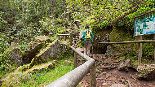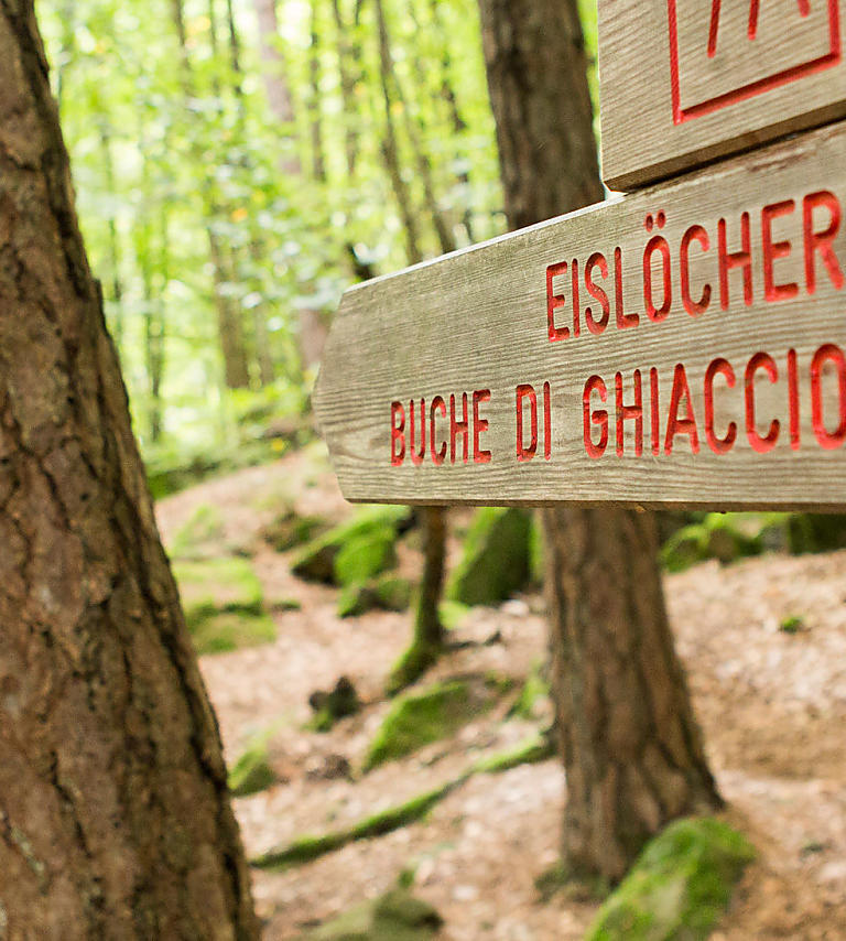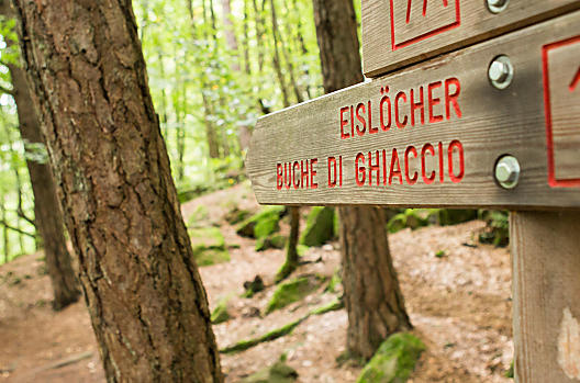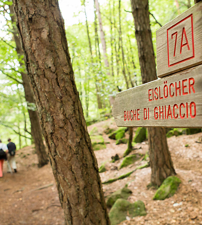 The Eppan Ice Holes may be reached from a variety of approaches and hiking guides have an equally-varied number of tips for walkers. An easy walk that is suitable for families with children starts at the centre of St. Michael Eppan. If arriving by car, there are plenty of parking spaces in front of the ice rink. The walk then leads past Eppan middle school and heads south between the houses. After a quarter of an hour, you turn right onto a woodland path and follow this for around 40 minutes, until you reach a forest crossroads. Here, you'll find a sign pointing to the Ice Holes, which are just 5 minutes away.